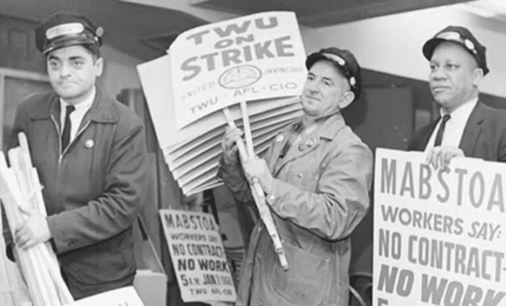 The twelve-day New York City transit strike in January 1966 is considered the first major citywide shutdown of subways and buses. About 33,000 workers, led by the Transport Workers Union, paralyzed the city on Mayor John Lindsay‘s first day in office.