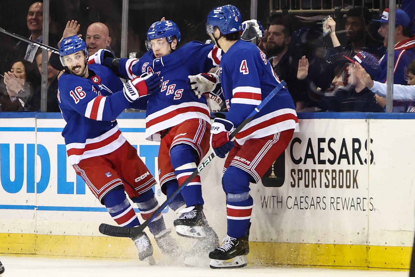 Apr 7, 2024; New York, New York, USA; New York Rangers left wing Artemi Panarin (10) celebrates with center Vincent Trocheck (16) and defenseman Braden Schneider (4) after scoring a goal in the third period against the Montreal Canadiens at Madison Square Garden. Mandatory Credit: Wendell Cruz-USA TODAY Sports