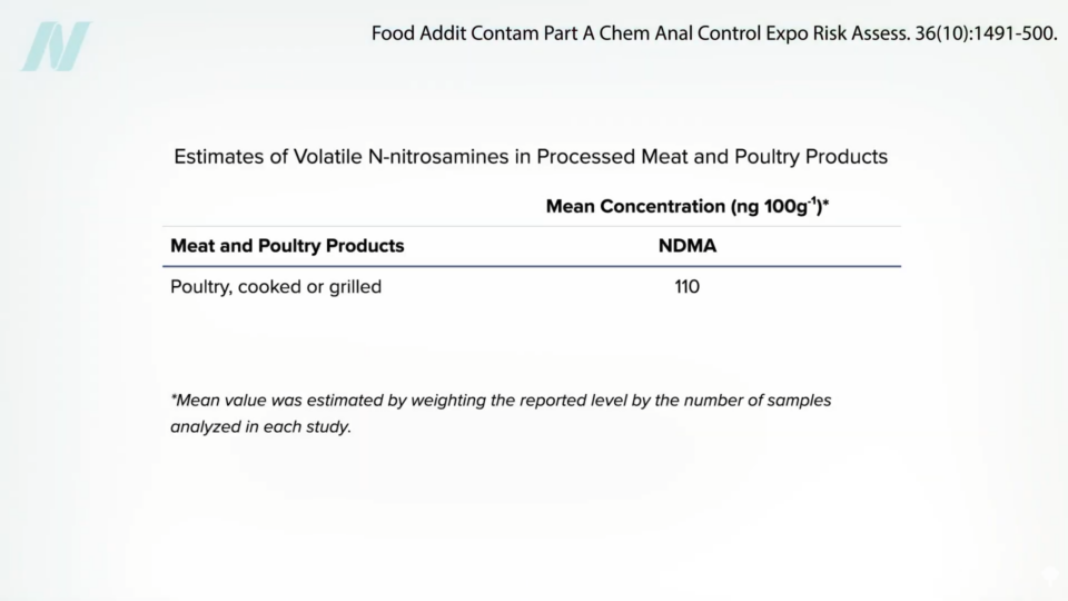 NDMA has not only been found in contaminated drugs. It is a known byproduct of tire plants, pesticide manufacturing, and leather tanning, and it is found in food and beverages, including processed meat and beer. Now that we know NDMA can transfer through the placenta, this may explain the relationship between maternal cured meat consumption during pregnancy and the risk of childhood brain tumors. For example, eating hot dogs while pregnant may increase childhood brain tumor risk by 33%, and sausages by 44%. Bacon consumption may increase childhood brain tumor odds by 60 or 70%. But it’s not just processed meat. Researchers have found it in poultry products as well. A single serving of chicken contains more than 100 nanograms of NDMA, as you can see below and at 3:02 in my video.