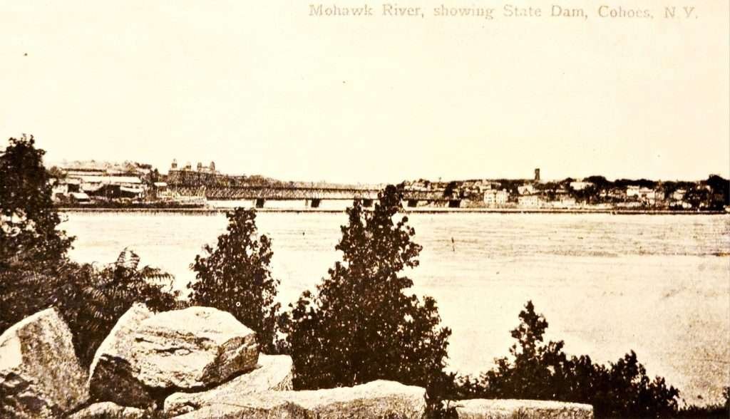Illustrations, from above: “Mohawk River Showing State Dam, Cohoes” showing where the Champlain Canal crossed the Mohawk by a slackwater pool created by the State Dam (Cohoes, with its Harmony Mills in the background, is to the left, the outskirts of Waterford are to the right); and a 1910 Sanborn Insurance map of Cohoes, annotated by the author.