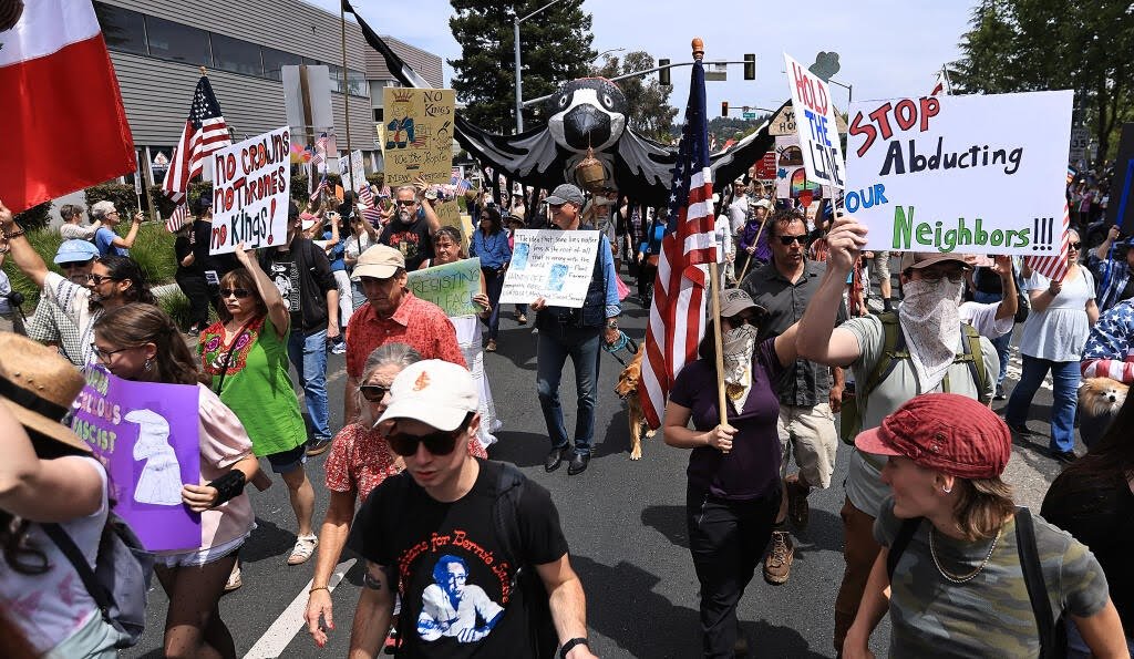 No Kings protesters march along Farmers Lane in Santa Rosa, Saturday June 14, 2025. (Kent Porter / The Press Democrat)