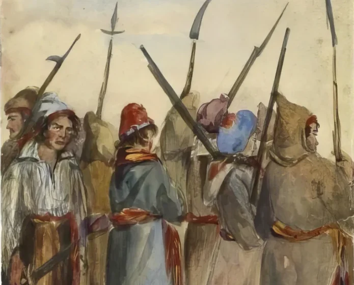 Illustration: A detail from a scene of Lower Canada Patriots in the November 1838 Battle of Beauharnois painted by Loyalist Katherine Jane Ellice, a British diarist and artist held prisoner by Patriot François Xavier Prieur.