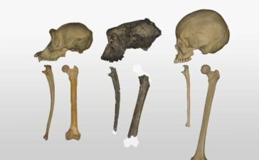 Sahelanthropus fossils (centre) compared with a chimpanzee (left) and a human (right)Wiliams et al., Sci. Adv. 12, eadv0130...