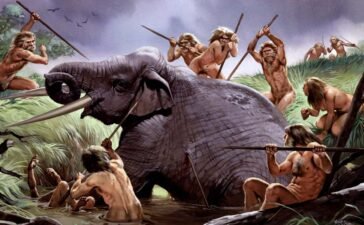 Ancient humans taking on an elephant – our ancestors may have begun butchering the animals 1.8 million years...