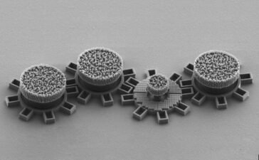 Gears about 10 micrometres wide made from etched silicon, viewed with an electron microscopeGan Wang / Myfab Chalmers...