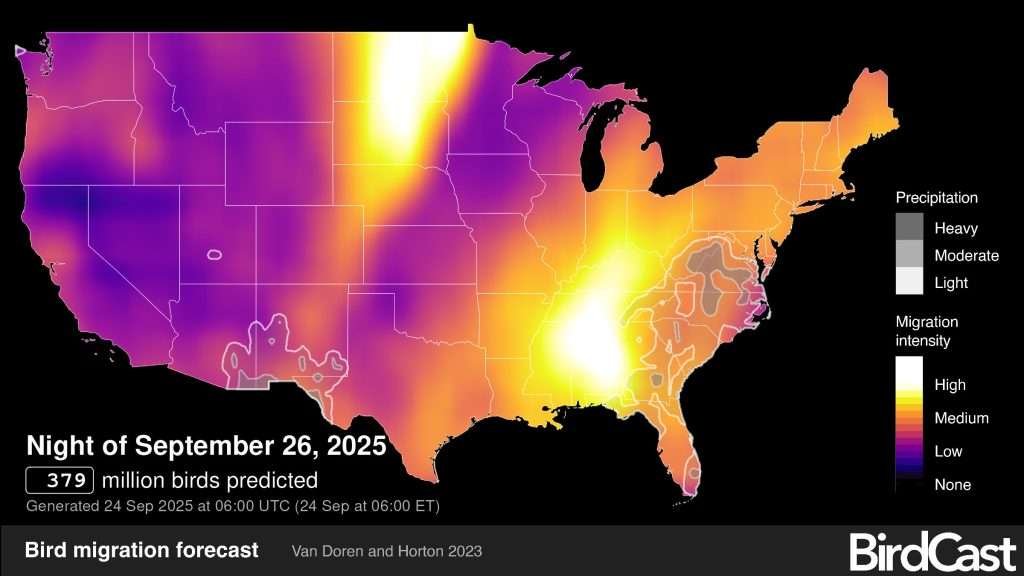 Illustration: BirdCast bird migration forecast map for September 26, 2025.