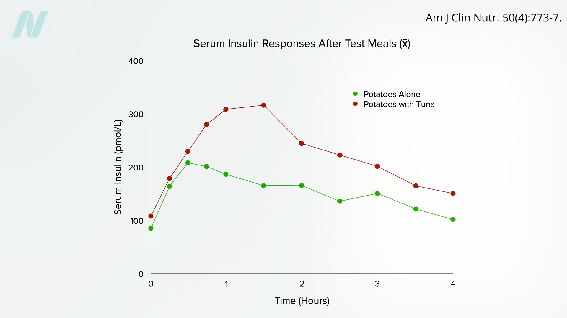 In my last blog, I explained how the act of chilling cooked potatoes can dramatically lower their glycemic index, even if you then reheat them in a microwave. How else might we reduce the glycemic impact of white potatoes? The same way you make anything better in your nutritional life—add broccoli. Eating two servings of cooked broccoli with your mashed potatoes would certainly do it, immediately cutting the insulin demand by nearly 40%. In contrast, adding chicken breast makes things worse, and adding tuna fish makes things even worse still, nearly doubling the amount of insulin your body has to pump out, as shown below and at 1:31 in my video.