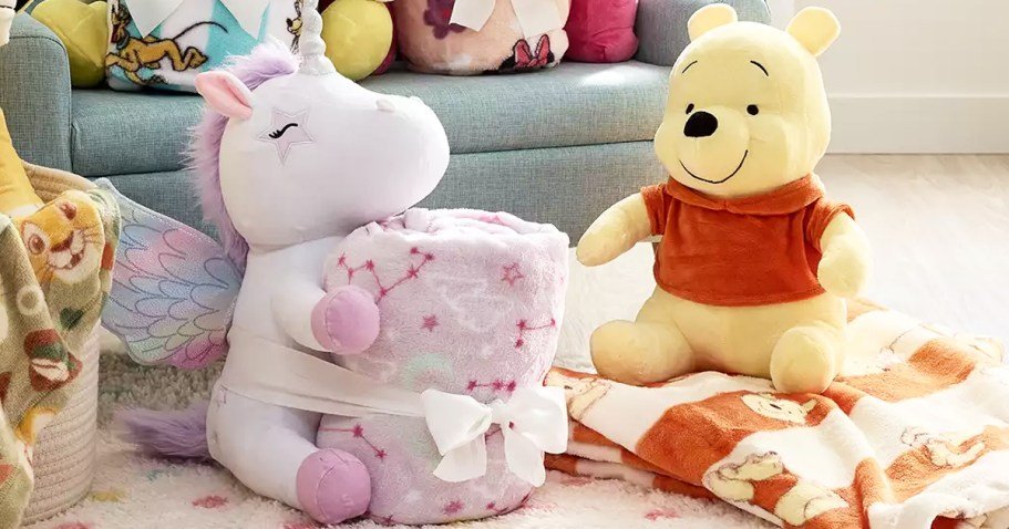 These buddy sets include a plush with a coordinating throw blanket and are available in tons of fun characters like Mickey Mouse, Winnie the Pooh, Simba, Spider-Man, and more!