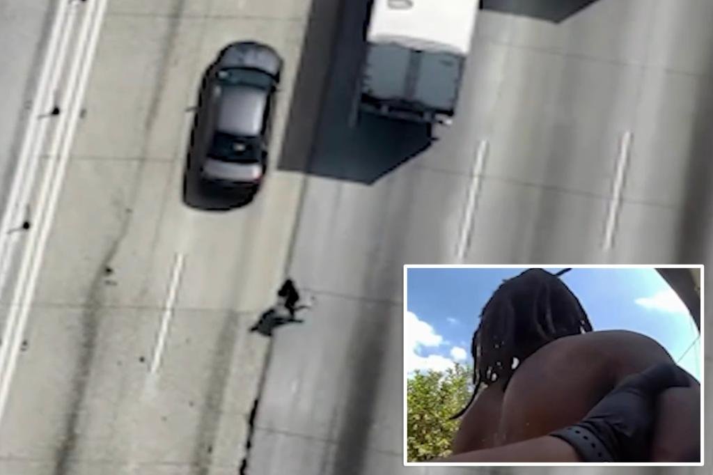 The bold suspect is shown in the aerial footage dodging traffic — narrowly passing between two speeding 18-wheelers — then crossing at least half a dozen traffic lanes before fleeing into a residential neighborhood.