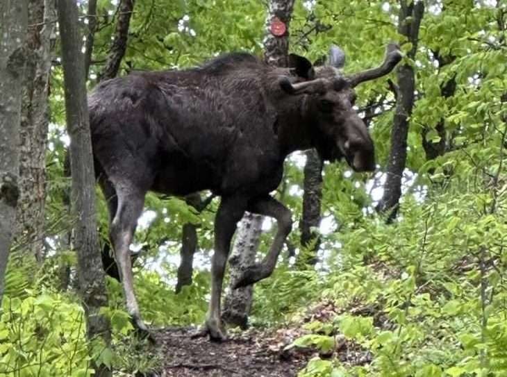 The moose was first sighted near the summit of Goodman Mountain in May when hikers reported the moose tolerating close human presence.