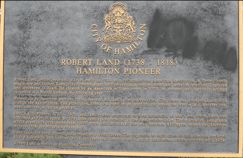Illustrations, from above: A historical sign recalling Robert Land’s settlement at Hamilton, Ontario; and Land’s burial vault in Hamilton.
