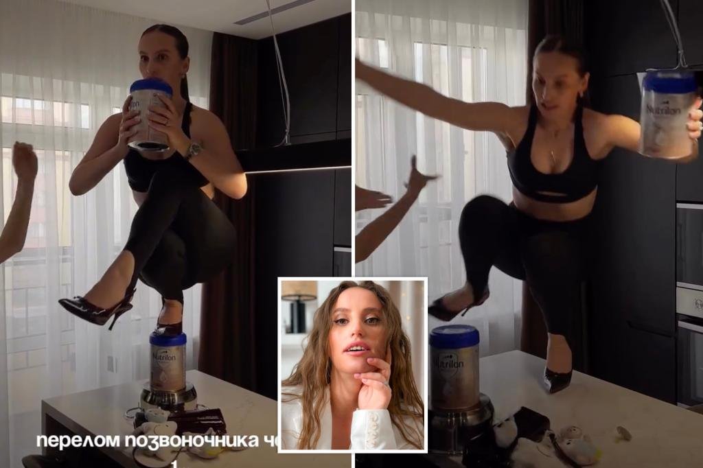 Video posted by Barutkina on Instagram shows her attempting to one-foot squat in heels on a baby formula container, which is balanced on a sauce pot that is itself placed on a marble-topped kitchen island.
