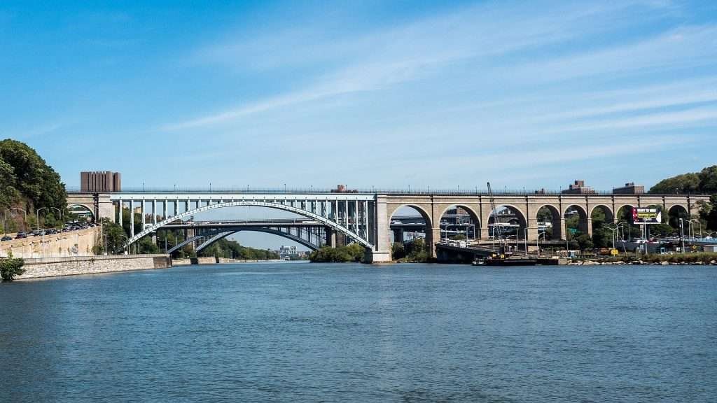 Illustrations, from above: High Bridge over the Harlem River, Manhattan-Bronx, New York City (looking north); a map of the Harlem River, shown in yellow; and a narrow section of the river in Westchester County.