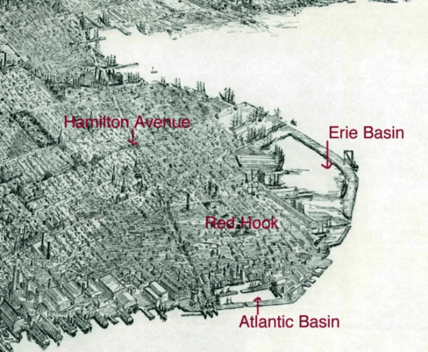 With the construction of the Atlantic Basin on Red Hook‘s western shore in the 1840s, Brooklyn became the region’s great bulk goods handling center. The material dredged from the basin provided fill for other areas of Red Hook.