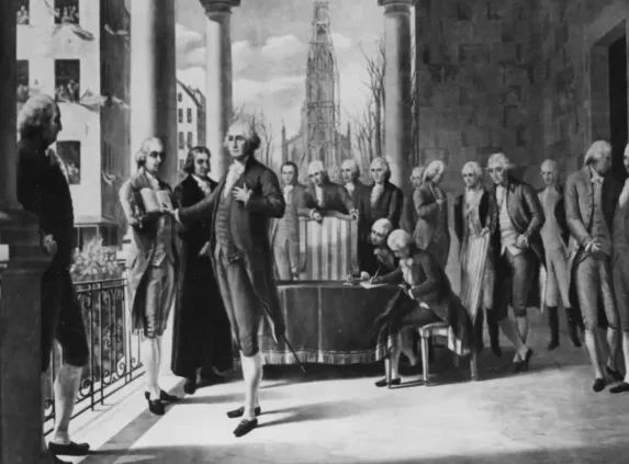 Illustrations, from above: Detail from an engraved scene depicting the inauguration of George Washington at Federal Hall, New York City on April 30, 1789; the view up Wall Street by Archibald Robertson, ca. 1798; and Federal Hall today with an 1882 statue of George Washington by John Quincy Adams Ward.