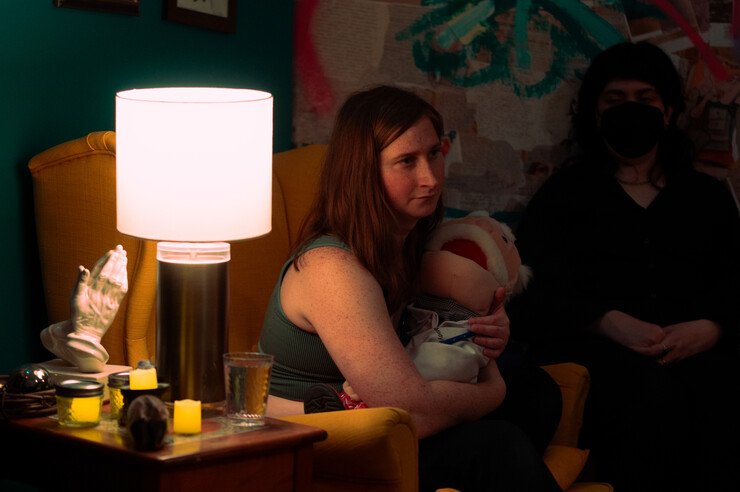 A person sitting in a dimly lit room holding a puppet of an old man.