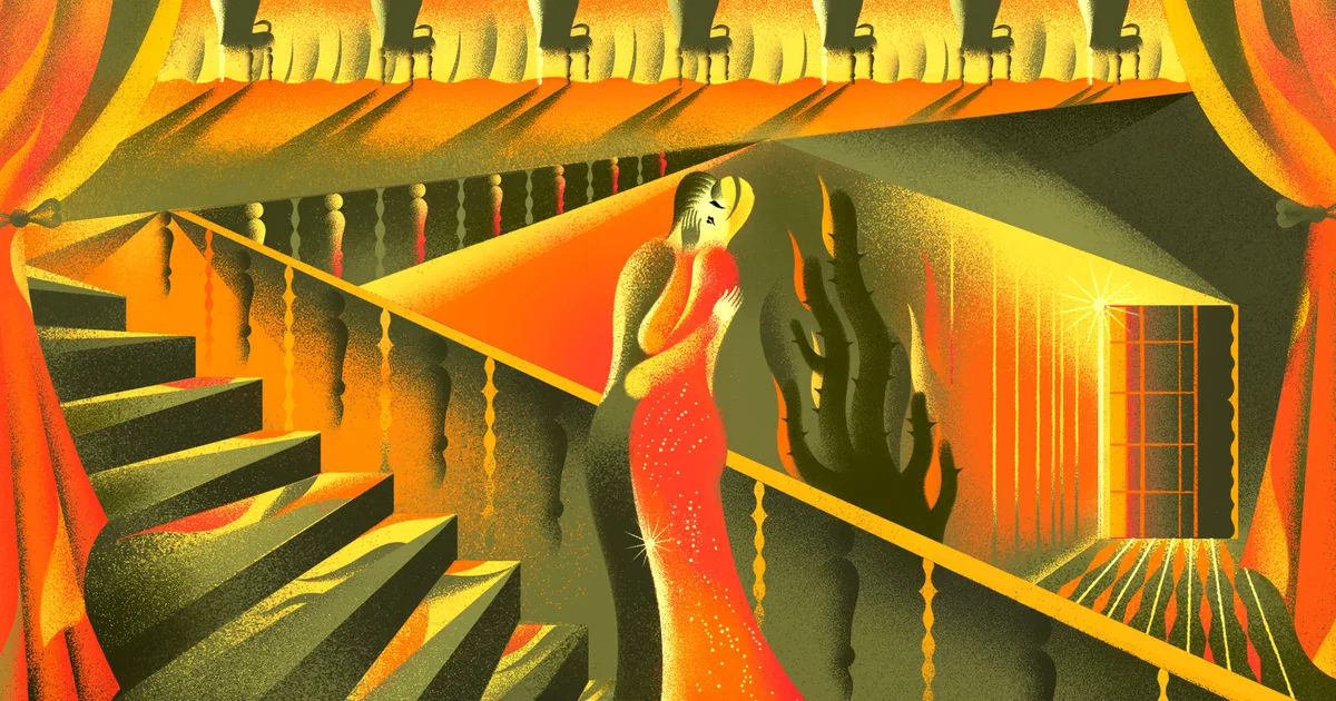 Emma visits San Remo, full of unformed hopes, and ends up shoplifting a book called Atelier Simultane about another Russian émigré to France, the artist Sonia Delauney. This book, with its colour-splashed cover, is a talisman for all that she is about to experience. Cannarozzi’s costumes veer into a new palette, as oranges and reds clothe Emma’s lower half. Undressing is established as a motif.