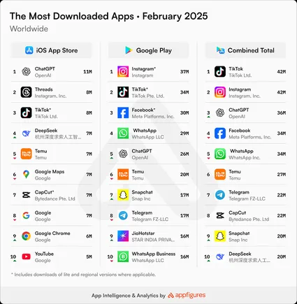 In terms of other download trends, ChatGPT rose two spots this month, while Threads remains popular on iOS.