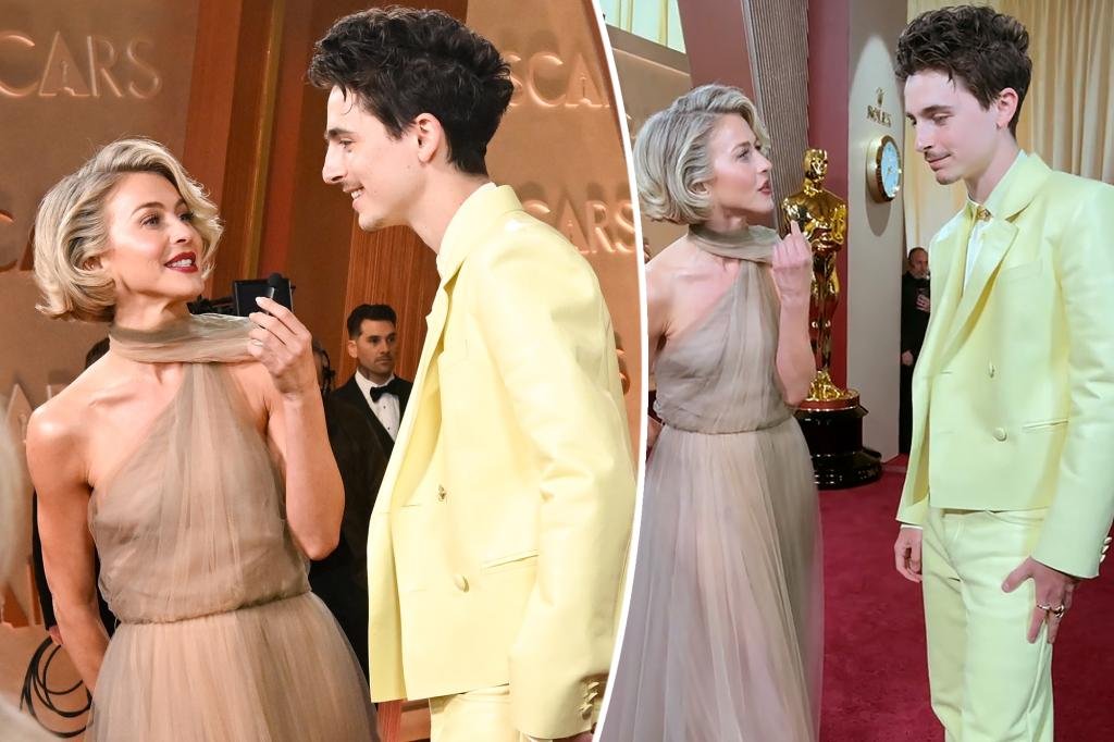 Julianne Hough’s awkward interview with Timothée Chalamet at the 2025 Oscars went viral. Penske Media via Getty Images