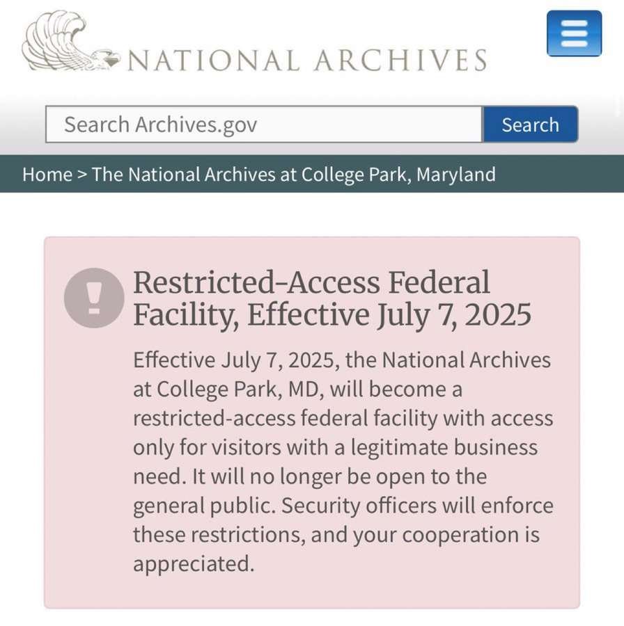 “Restricted-Access Federal Facility, Effective July 7, 2025: Effective July 7, 2025, the National Archives at College Park, MD, will become a restricted-access federal facility with access only for visitors with a legitimate business need. It will no longer be open to the general public. Security officers will enforce these restrictions, and your cooperation is appreciated.”