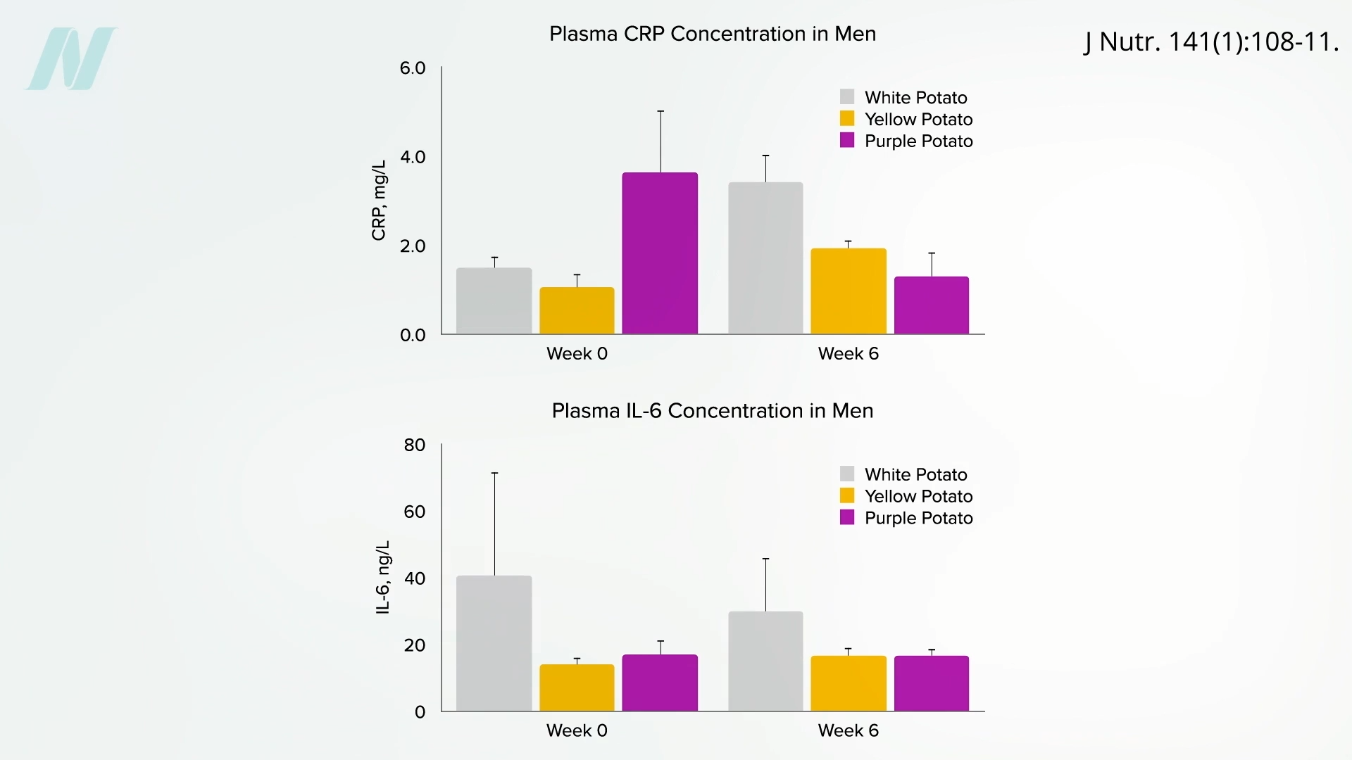 The purple potato pigments may also affect inflammation. The Potato Association of America likes to paint potatoes as an anti-inflammatory food, but what it doesn’t tell you is that this benefit may be limited to pigmented potatoes. When study participants were randomized to eat a small white potato every day for six weeks versus a yellow- or purple-fleshed potato, those in the purple potato group achieved significantly lower levels of inflammation compared to those in the white potato group, measuring both C-reactive protein and interleukin-6, shown below and at 3:13 in my video.