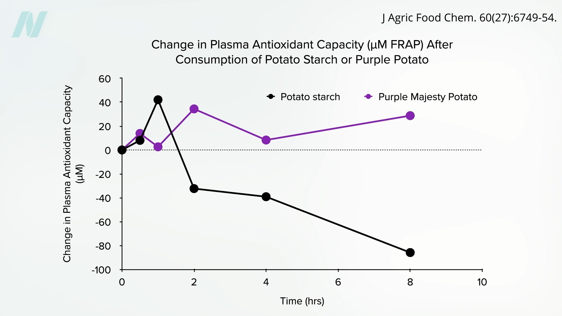 Purple potatoes can increase the antioxidant capacity of our bloodstream, whereas straight white potato starch can act as a pro-oxidant and decrease it. Eat a purple potato, and, over the next eight hours, the antioxidant capacity of your bloodstream goes up. In contrast, if you eat white potato starch devoid of any pigment, you can end up worse off than where you started, as you can see below and at 4:12 in my video.