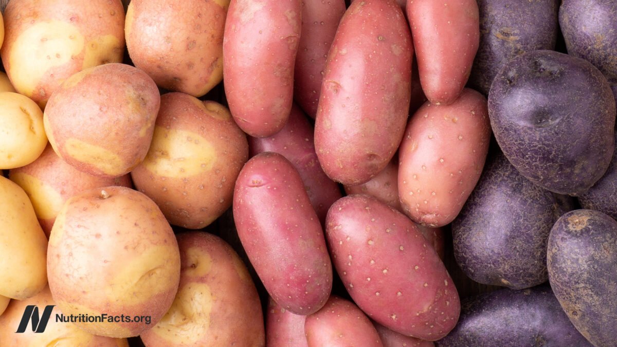 So, if you’re going to eat a high glycemic food, you may be able to moderate its impact by, for example, spreading raspberries on your toast, adding strawberries to your cornflakes, or sprinkling blueberries into your pancake batter. I’m not saying you have to put blackberries in your baked potato, but given that the natural color compounds in fruits can slow down starch digestion, what about pigmented potatoes?