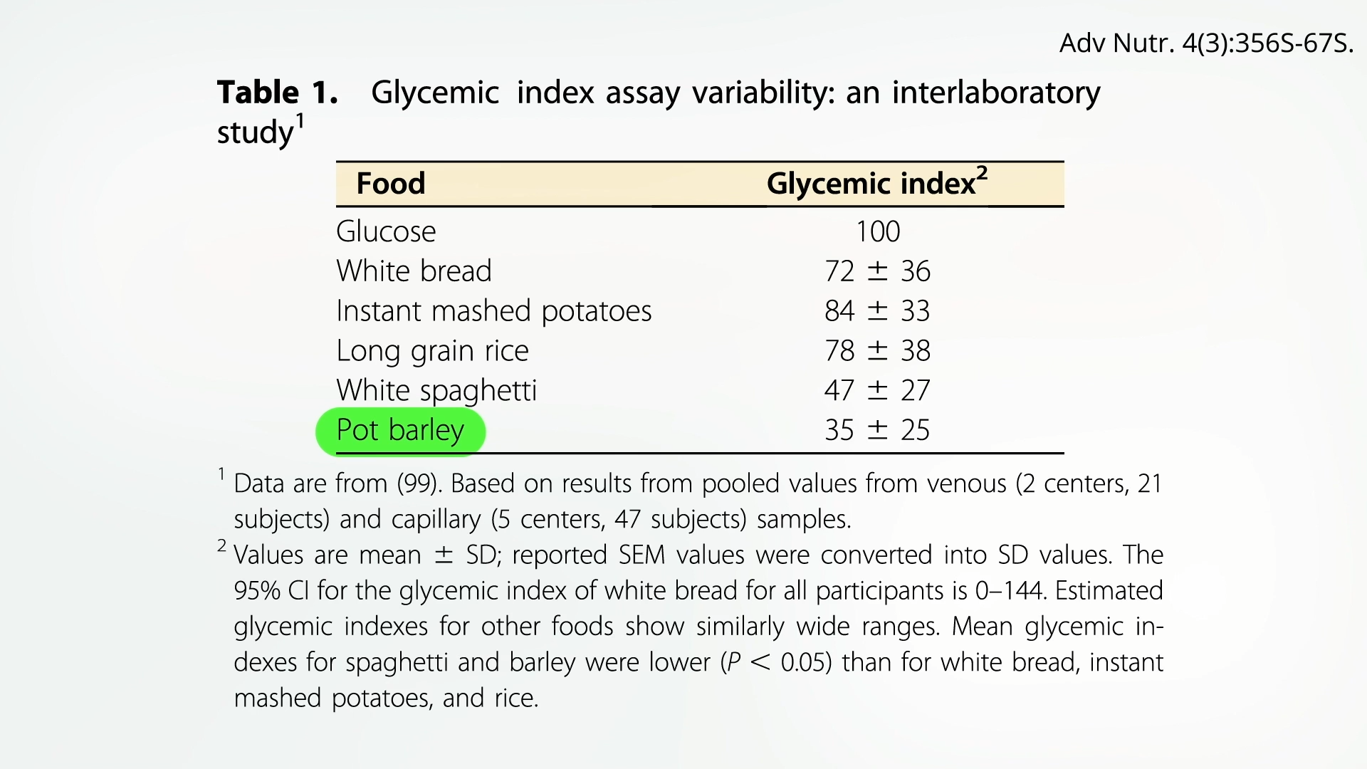 A front group for the potato industry called the Alliance for Potato Research and Education funded a study that found that intake of non-fried potatoes does not affect blood sugar markers, when compared with the likes of Wonder Bread, that is, so that isn’t really saying very much. Foods with a glycemic index (GI) higher than 70 are classified as high-GI foods (high glycemic index foods), and those lower than 55 are low-GI foods. Pure sugar water, for example, is often standardized at 100, and white bread and white potatoes are also way up there as high glycemic index foods. But when you compare them to an intact grain, like barley groats (also known as pot barley), which is a super-low GI food, you can see how refined grains and potatoes are simply no match. Check out the numbers below or at 2:47 in my video.