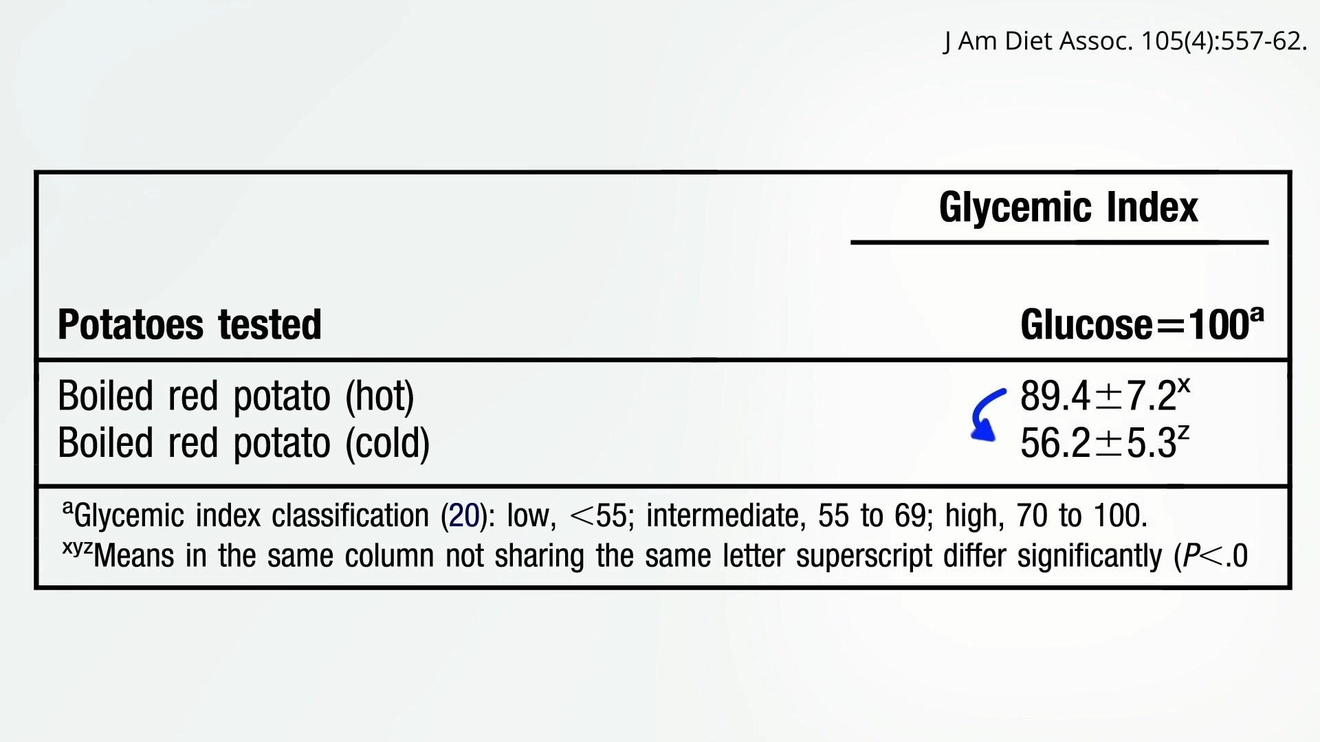 However, the amounts of this so-called resistant starch that are formed are relatively small, making it hard to recommend cold potatoes as a solution. But when put to the test, you actually see a dramatic drop in glycemic index in cold versus hot potatoes, shown below and at 3:23 in my video.