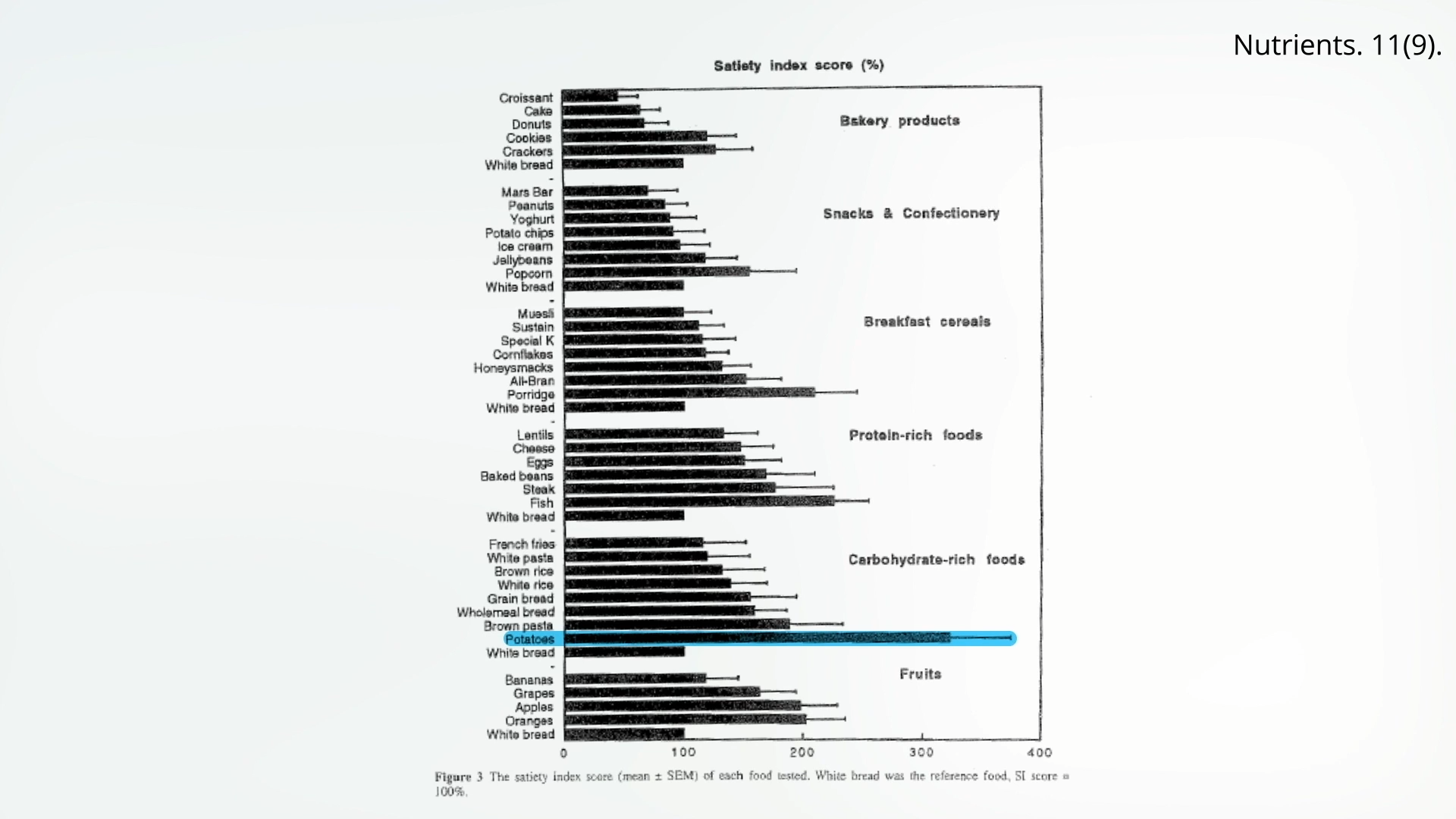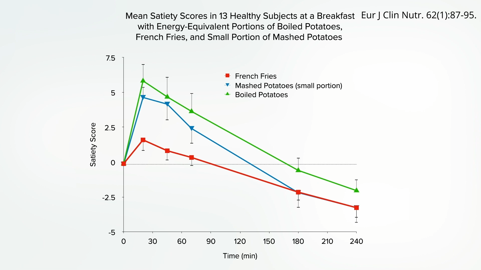 There is actually an appetite-suppressing protein in potatoes called potato protease inhibitor II, but the way you prepare your potatoes makes a difference. Both boiled and mashed potatoes are significantly more satiating than French fries, as shown below and at 4:26 in my video.